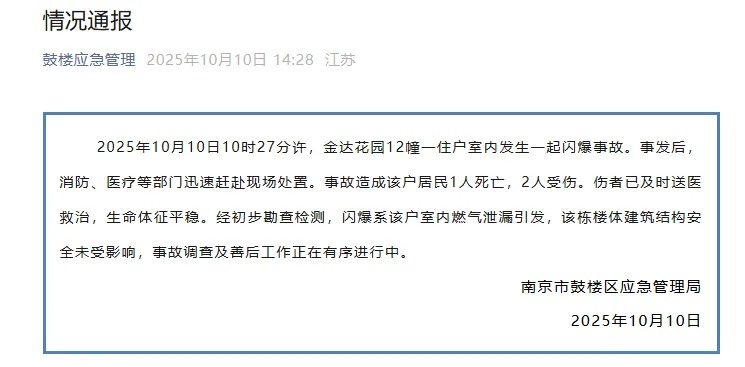 10月10日10时27分许,金达花园12幢一住户室内发生一起闪爆事故。事发后,消防、医疗等部门迅速赶赴现场处置。事故造成该户居民1人死亡,2人受伤。伤者已及时送医救治,生命体征平稳。经初步勘查检测,闪爆系该户室内燃气泄漏引发,该栋楼体建筑结构安全未受影响,事故调查及善后工作正在有序进行中。